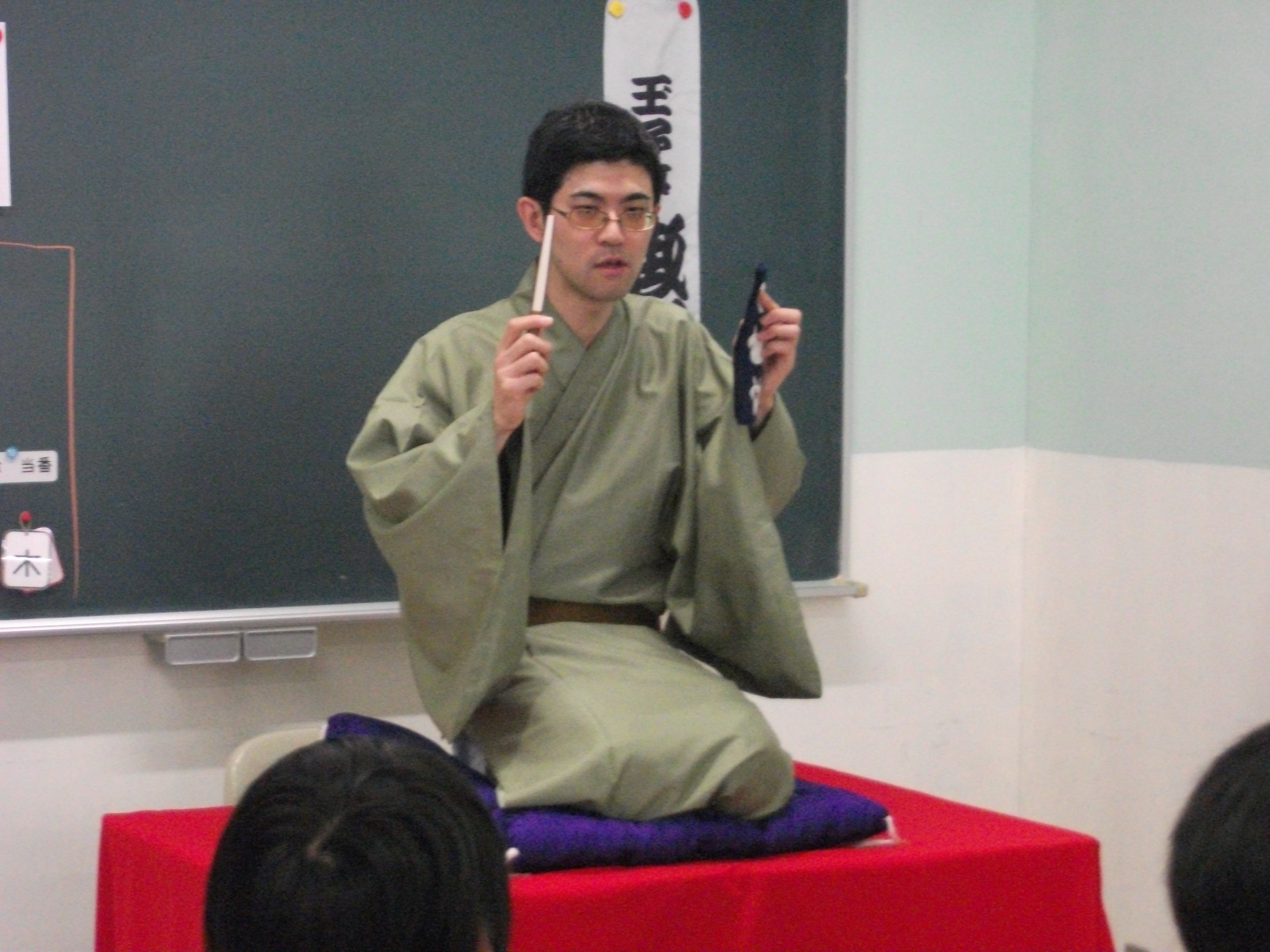 「特別HR 落語」 月に1回の特別HR、12月は落語のテーマ。HRといっても内容は落語を実際に聞くというものです。HRが始まり入場の音に合わせて袴姿の先生が入場してきます。少し前まで数学の授業をして...
